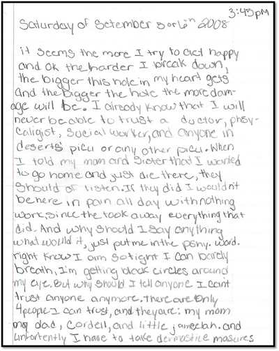 Our daughter Chaunell Roberson wrote this while in Arizona Child Protective Services foster care. You can see from these letters just how frightening it must be for our children. This also shows how often children are threatened if they do not obey they will be sent to a psch ward. We have heard from former foster children that they were threatened with being placed in a psychiatric ward if they did not "obey" the house rules. (see SVS CR letter 9.5.2008 in Downloads below)
