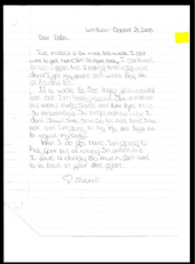 Our daughter Chaunell Roberson wrote this while in Arizona Child Protective Services foster care. You can see from these letters the exposure of sex and inappropriate dress. You can see how settle jesters can persuade a child to make the changes the system desires. Guided by adults in power and control. This shows you a deep insight to what really goes on behind closed doors. You never get the child perspective only adults in power telling what your child wants or sees. (see SVS CR letter 10.24.2008 in Downloads below)