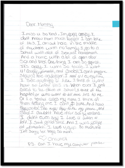 Our daughter Chaunell Roberson would write home to us telling us what she was witnessing in CPS custody and the abuse she was receiving while in foster home. (see SVS Dear Mommy Download below)